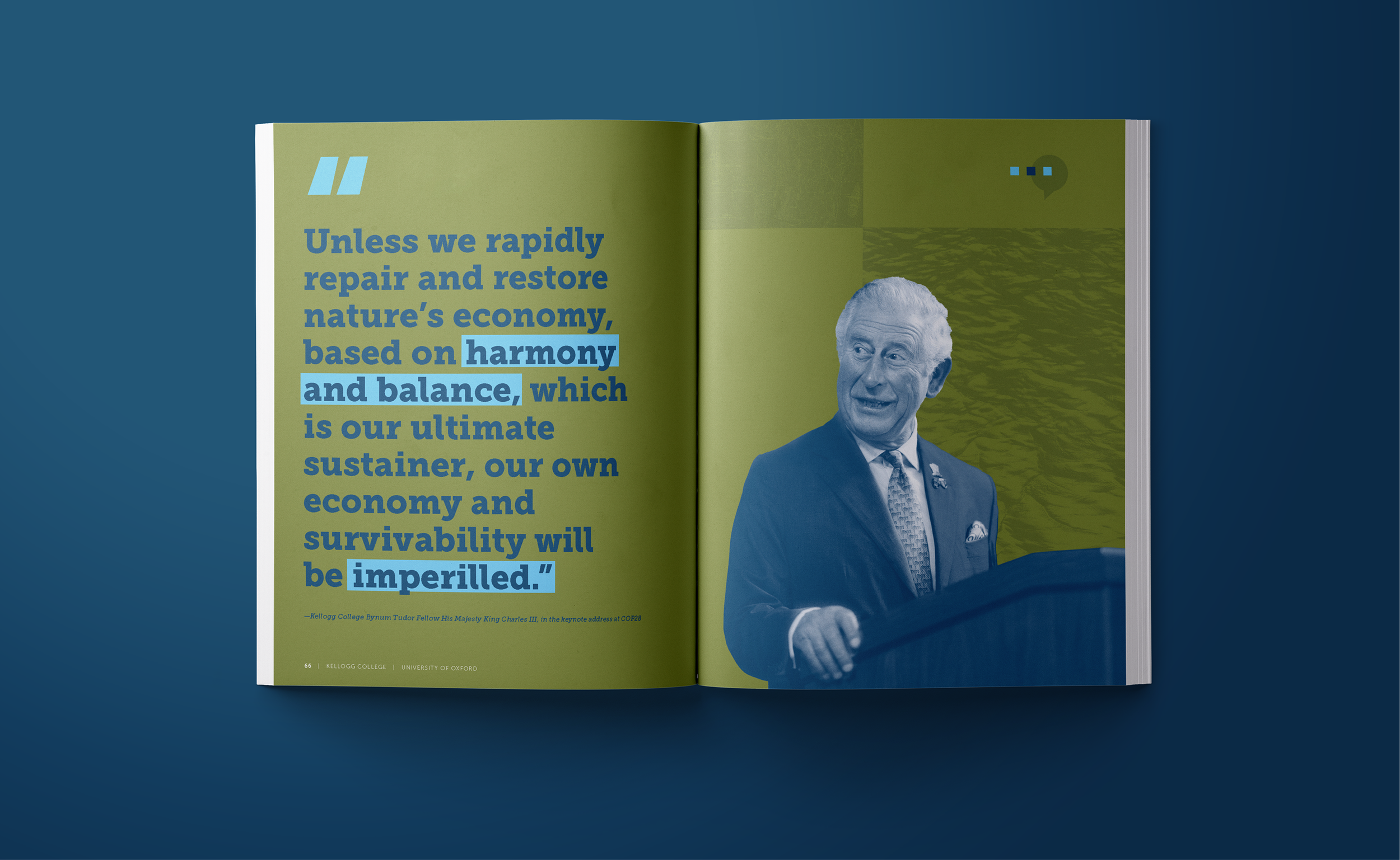 The “Heritage Collage” approach uses layered imagery to connect past and present, combining archival references with contemporary photography and graphic elements. The duotone treatment creates a unifying thread across sections while giving each story its own emotional tone. Collage becomes a storytelling device rather than decoration, helping convey complex, interdisciplinary ideas in a more immediate way. The result is a visual language that feels uniquely Kellogg and unmistakably Oxford
